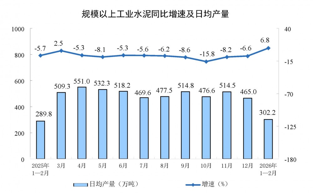 國家統(tǒng)計局?jǐn)?shù)據(jù)顯示,2026年1-2月份,全國規(guī)上工業(yè)水泥產(chǎn)量17827萬噸,同比增長6.8%。